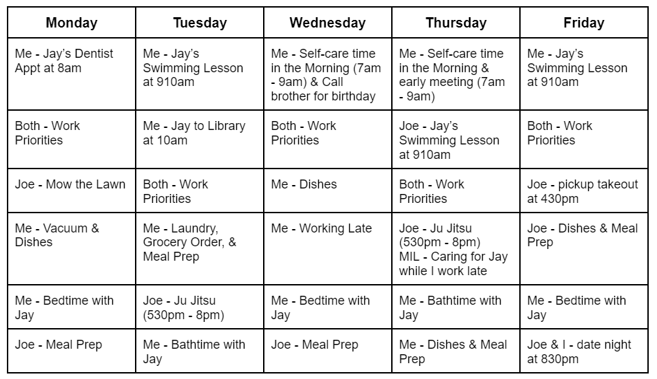 Personally, I typically have my son in the mornings from 6:30am - 9:00am when we leverage our childcare. Then, I start work at 9:30am and typically work until 7:00pm. My husband then has our son from 5:00pm - 7:00pm until I’m done working. Then, our family of 3 is together until my son’s bedtime at 8:30pm. By that time, it’s the end of the day and my husband and I have both had a really full day. When do my husband and I get time to exercise, get out of the house by ourselves, spend time with friends, etc…? When do we get time together as a couple, without our son and outside of our house? As you can guess, it is really hard to do that based on our current personal and professional schedules.