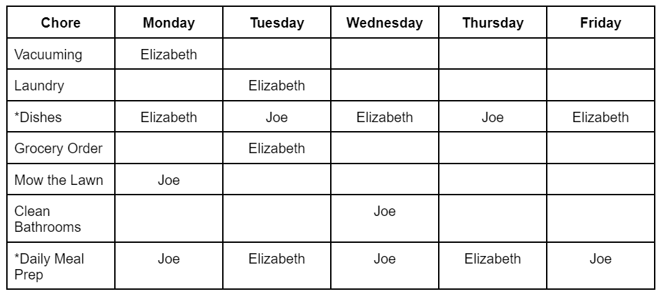 Elizabeth: “Who is putting in the food order this week? I can because I have a couple house things I noticed we need to get too like shaving cream.” Joe: “Sure, you can put in the food order. I think we will be low on food on Tuesday so can you put in the food order tomorrow?” Elizabeth: “Yup yup yup. I’ll put a reminder on my calendar.”
